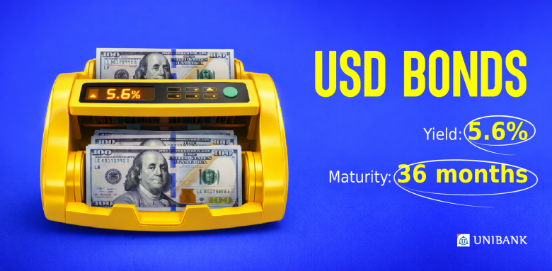 Unibank announces a new issue of USD bonds in the amount of 5 million USD. The coupon rate is 5.6% per annum, which will be paid on a quarterly basis.