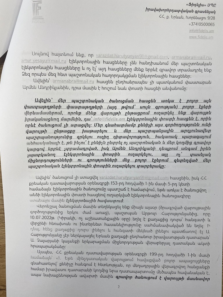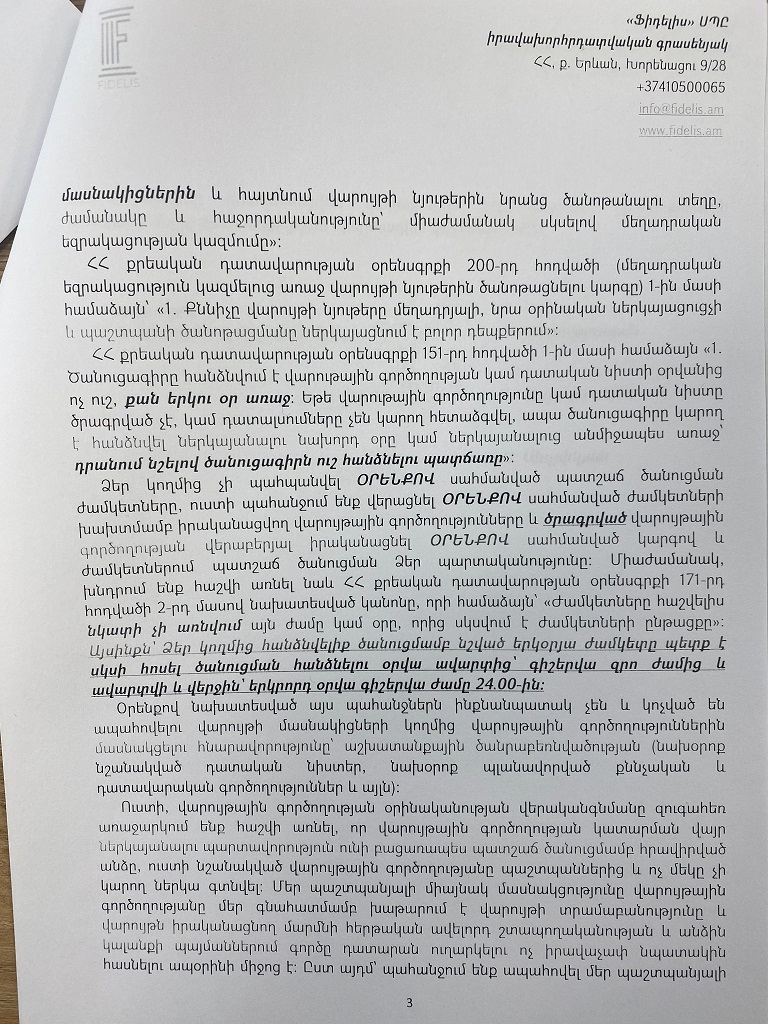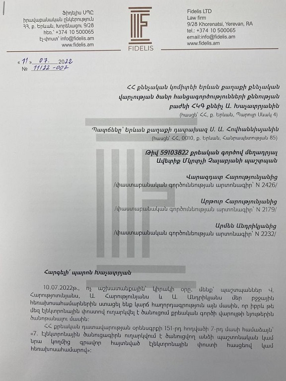 Below is a photocopy of our letter to the investigator and the prosecutor of the city of Yerevan, with all the legal and factual justifications.