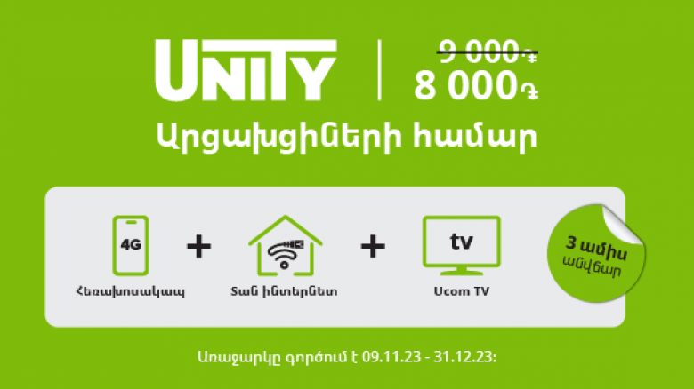 With care and commitment to social responsibility, Ucom has presented a new offer to compatriots forcibly displaced from Artsakh. Until December 31, subscribers who join the Unity 9000 regional tariff plan for the fastest home internet can use the service for free for 3 months, and if they continue the subscription, they will pay 8000 AMD instead of 9000 AMD. Unity is one of the best offers of Ucom, simultaneously providing mobile telephony, fixed Internet, 210+ TV channels, and the best devices for a comfortable daily life and always being connected.