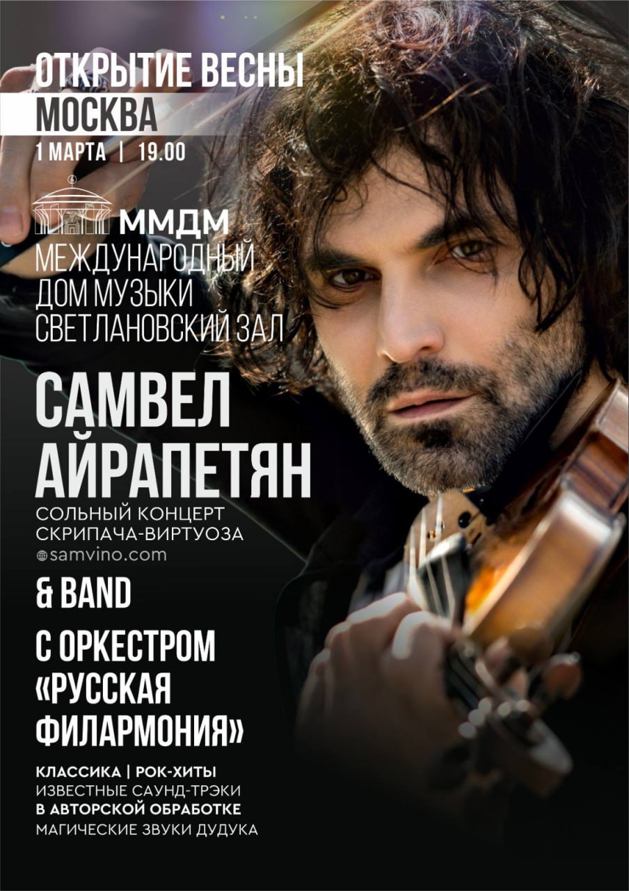 1 марта в 19:00 в Московском международном Доме музыки пройдет концерт скрипача-виртуоза Самвела Айрапетяна и его бэнда при участии оркестра «Русская филармония». Гостей ждет экспрессивное шоу, объединяющее классику и современное звучание.