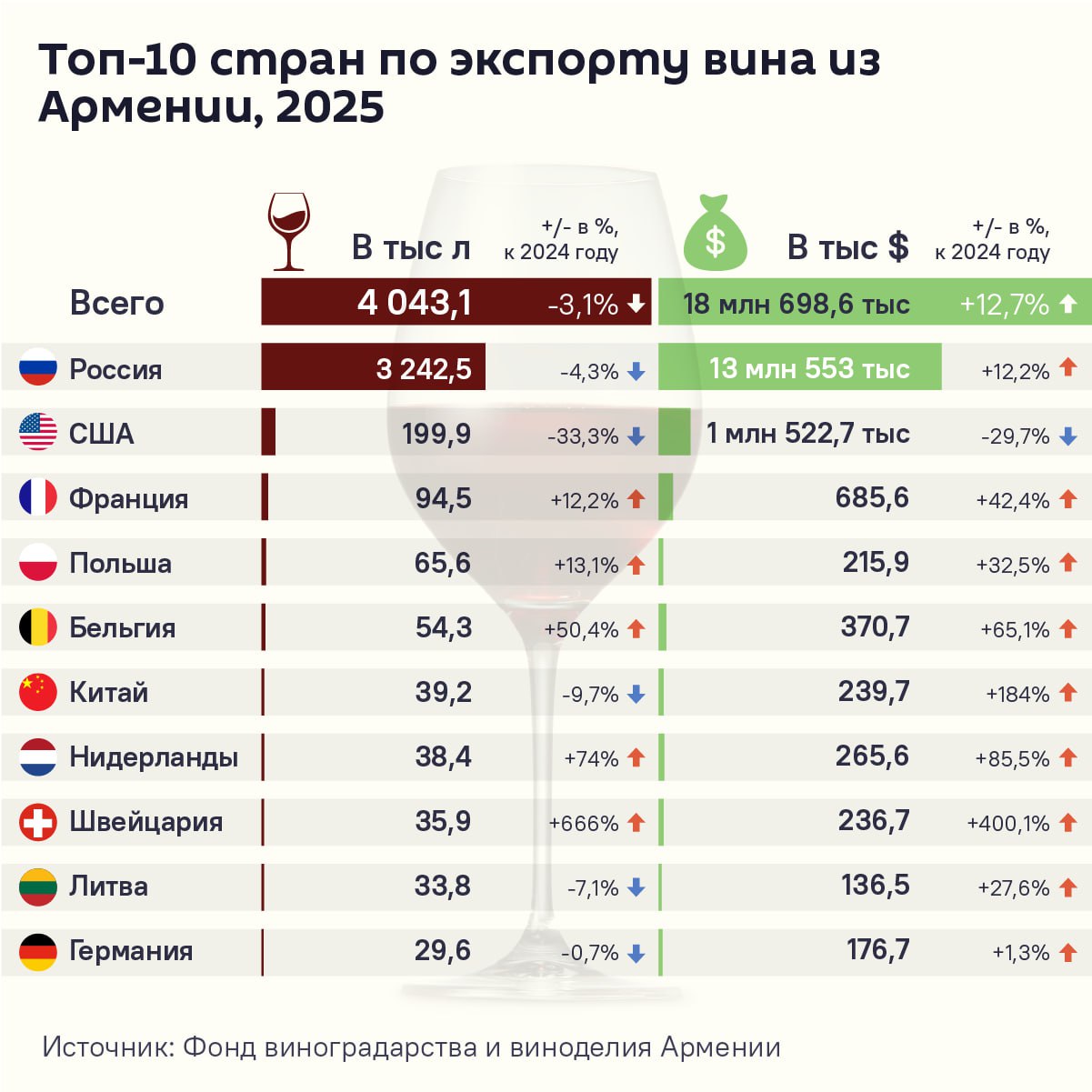 Россия остается основным рынком для армянского вина – около 72% экспорта, что составляет 3,2 млн литров. Второе место по объемам занимает США.