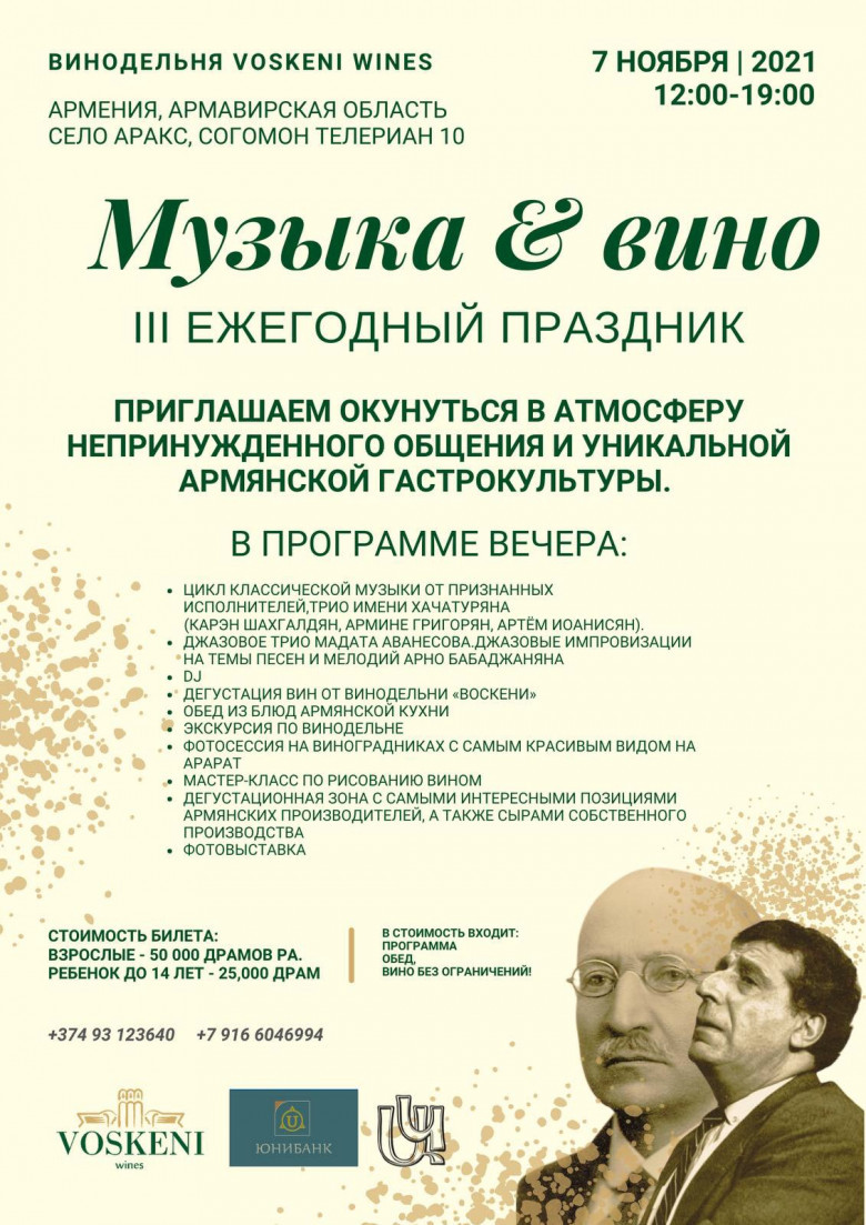 7 ноября в Армении, на винодельне Voskeni Wines, состоится третий ежегодный праздник «Музыки и вина». В этот раз мероприятие будет посвящёно двум знаменитым армянским композиторам: 150-летию Александра Спендиарова и 100-летию Арно Бабаджаняна.