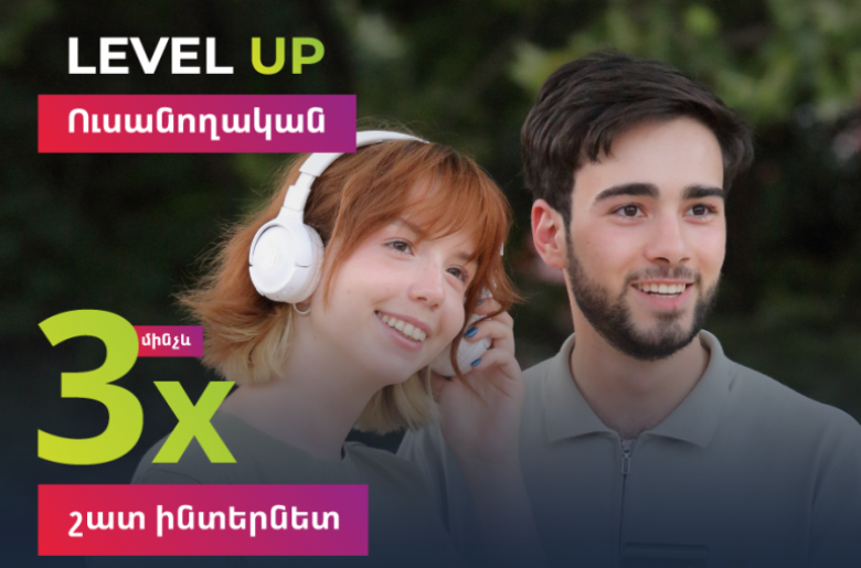 До 31 декабря сего года любой студент, являющийся новым или текущим абонентом компании Ucom, может подключиться к постоплатному тарифному плану Level Up 3000 и в течение 24 месяцев получать в 3 раза больше высокоскоростного интернета, то есть 30 ГБ вместо обычных 10 ГБ. А при подключении к предоплатному тарифному плану Level Up 1700 студенты получат в 2 раза больше высокоскоростного мобильного интернета, а именно: 12 ГБ вместо 6 ГБ.