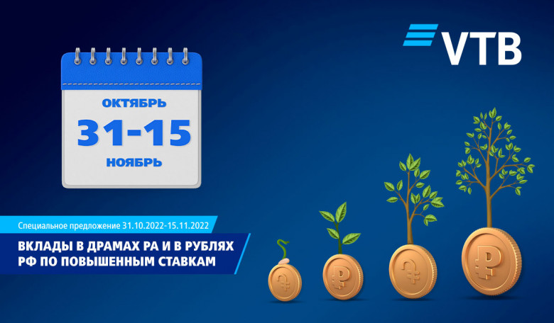 ВТБ (Армения) улучшает условия для населения по депозитам к Международному дню сбережений. В зависимости от срока размещения максимальная процентная ставка по вкладам в драмах РА увеличилась на 0,5 п.п., – до 10.5%. В российских рублях рост составил 3 п.п., – до 5.5%. Предложение распространяется на продукты «Выгодный» и «Прогрессивный».
