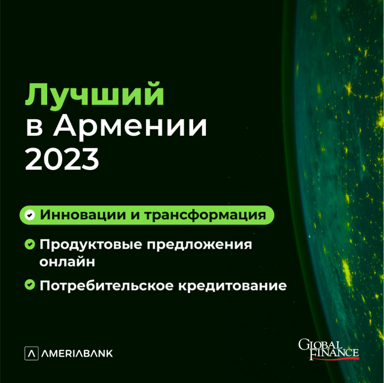 Америабанк признан победителем в 3-х номинациях в рамках премии журнала «Global Finance» «Лучший цифровой банк». В частности, Банк получил награды в номинациях «Лучшие инновации и трансформация в Армении в 2023г.», «Лучшие продуктовые предложения онлайн в Армении в 2023г.» и «Лучший в области потребительского кредитования в Армении в 2023г.».