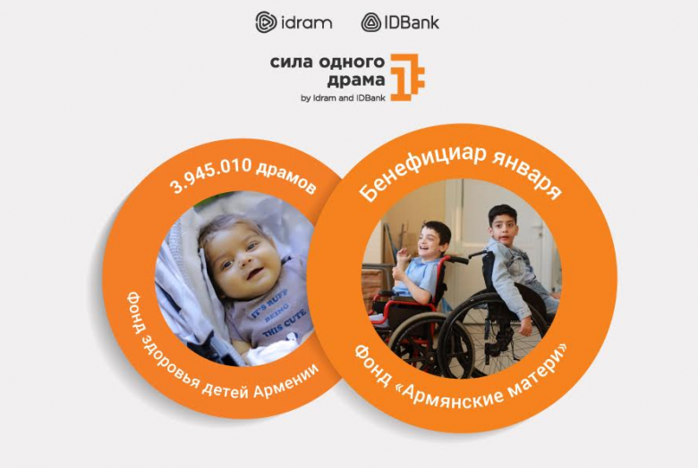Идрам и IDBank подводят итоги декабрьской программы инициативы «Сила одного драма». Сумма, собранная от платежей клиентов обеих компаний в декабре, 3.945.010 драмов, будет направлена в Фонд здоровья детей Армении.