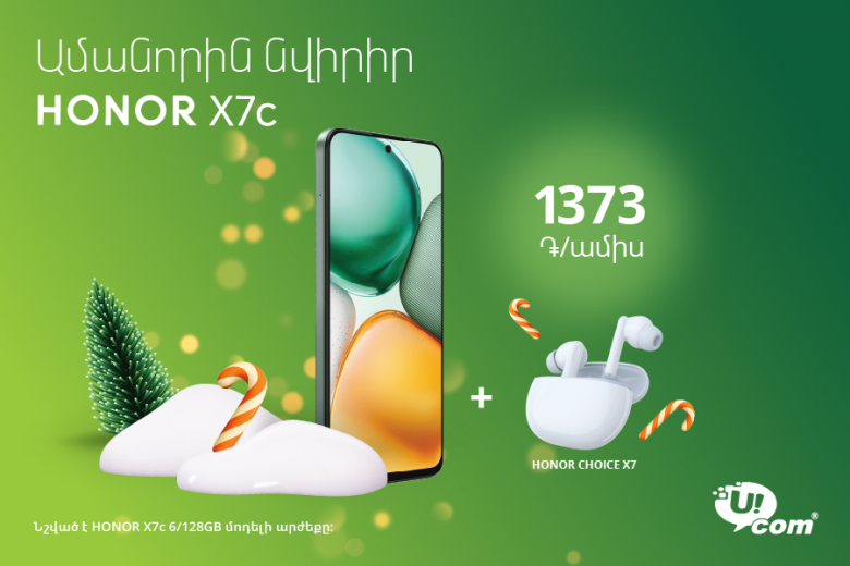 В преддверии новогодних праздников Ucom объявляет традиционную новогоднюю акцию, в рамках которой смартфон HONOR X7c можно будет приобрести в центрах продаж и обслуживания и через интернет-магазин на сайте компании в рассрочку, с ежемесячной платой от 1373 драмов.